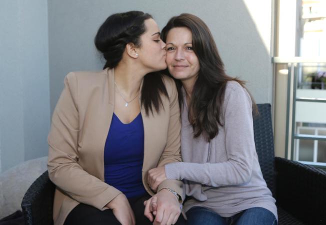 Sophie Serrano, bên phải, được con gái cô là Manon hôn