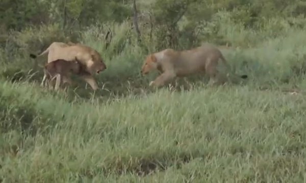 Có lẽ ở một tình huống khác thì con bê này đã nằm gọn trong dạ dày của sư tử rồi. Nhưng kì lạ là sư tử lại chơi đùa và bảo vệ chú bê con như con mình vậy. Thậm chí sư tử còn đuổi cả đồng loại mon men lại gần...