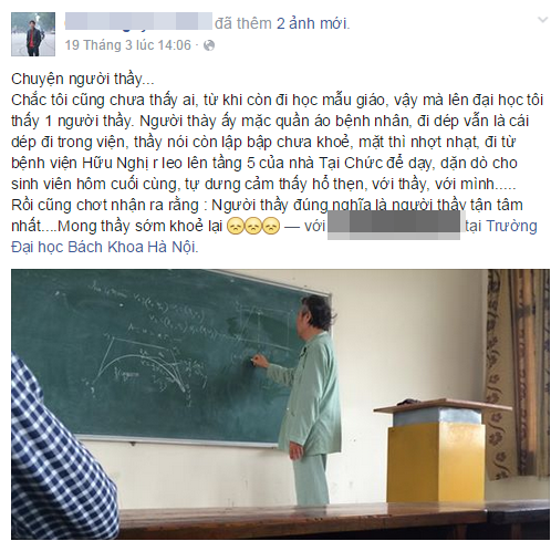 Ngày 19/3 vừa qua, những dòng tâm sự từ facebook của sinh viên Nguyễn Xuân Chiến (Đại học Bách Khoa Hà Nội) cùng hình ảnh người thầy giáo “mặc quần áo bệnh nhân, chân xỏ dép bệnh viện trên giảng đường đã khiến người đọc xúc động, cảm phục.