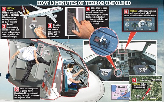 Mô tả cảnh cơ trưởng tuyệt vọng phá cửa buồng lái. Ảnh: Daily Mail