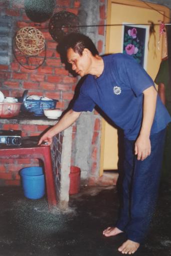 Tên Nguyên lấy con dao ở kệ bếp (Ảnh thực nghiệm hiện trường).