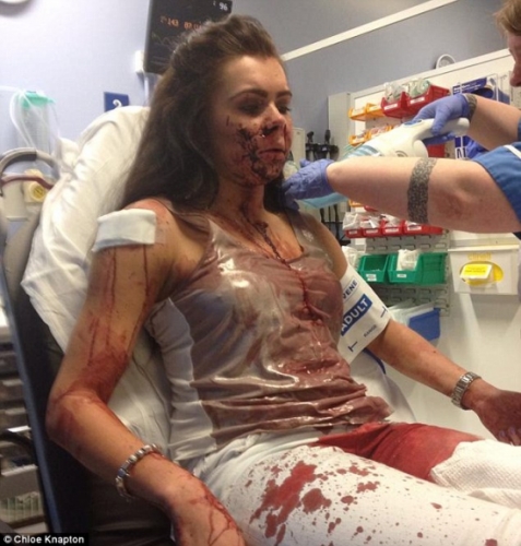 Knapton bị các vết thương sâu ở vai, cổ, mũi, miệng do kính vỡ đâm vào. Thậm chí mảnh vỡ của chai thủy tinh c̣n găm sâu vào cổ cô (ảnh: Daily Mail).