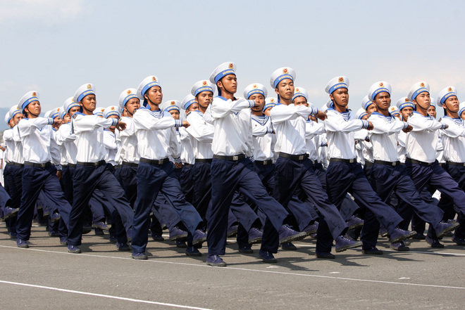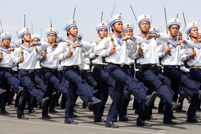 Trên bộ, đội Quân kỳ quyết thắng của quân chủng Hải quân dẫn đầu đoàn diễu binh tiến qua lễ đài.