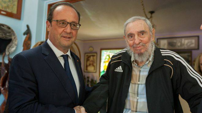 Mới đây Fidel Catro trong ảnh gặp với ông tổng thống Pháp Francois Hollande dẫn đầu sang thăm Havana vừa ký thỏa thuận về khai thác dầu ngoài khơi. Trong ảnh có thể thấy chủ tịch lãnh tụ Cuba mặc áo Adidas.