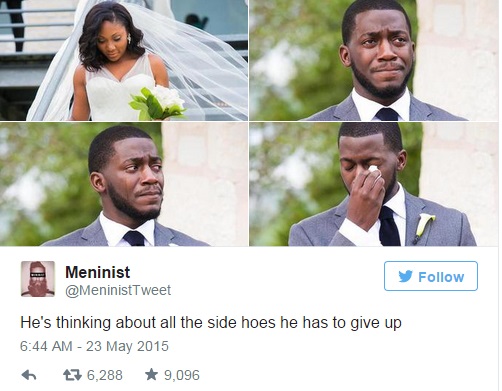 Tháng 9 năm ngoái, chú rể 23 tuổi Adam Harris cùng vợ Tisa đã tổ chức lễ cưới đầy lãng mạn và xúc động tại quê nhà ở Dripping Springs, Texas, Mỹ. Tuy nhiên, mới đây, trang Twitter khá nổi tiếng có tên “Meninist” mới đăng tải những bức ảnh về lễ cưới của cặp cô dâu chú rể người Mỹ cùng lời chế nhạo "Anh ấy đang nghĩ về việc phải từ bỏ bồ bịch".