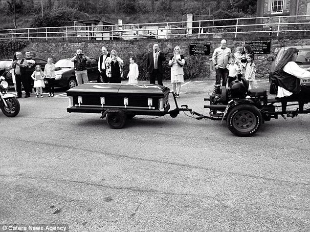 Chiếc quan tài màu đen được in hình thần chết ở trên là tài sản của anh trai cô dâu, Roger. Anh là một người yêu thích mô-tô nhưng năm ngoái đã lên cơn đau tim và không thể di chuyển được như bình thường. Vì vậy cặp đôi quyết định tổ chức đám cưới tại xứ Wales, gần nơi Roger sống để anh có thể đến tham dự.