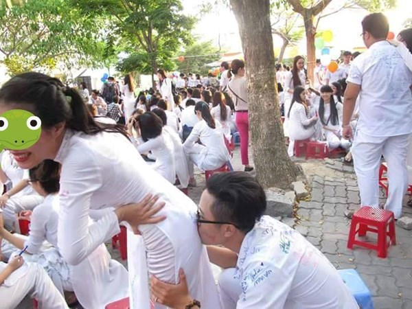 Viết lưu bút, kí tên lên áo và giữ làm kỉ niệm là việc làm phổ biến. Thế nhưng hình ảnh viết lưu bút lên ngực, lên mông thế này quả thật khiến người xem “đỏ mặt” vì ngượng.