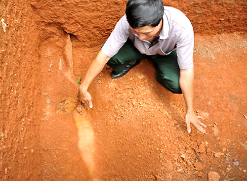 Theo anh Khoa, hôm 31/5 anh thuê người đào hầm để xây bể xử lý nước thải sinh hoạt. Khi đào được hơn một mét thì phát hiện mảng sắt rất to, giống đuôi cánh quạt. Tiếp tục đào lên phía trên, nhóm thợ hoảng hốt khi hình dạng một quả bom "khủng" dần hiện ra. Sự việc nhanh chóng được trình báo chính quyền địa phương.