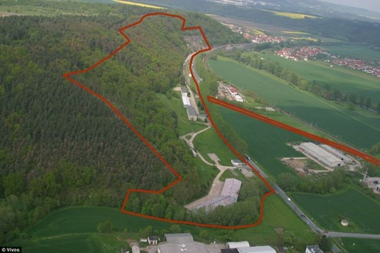 Hình ảnh trên không cho thấy ranh giới của Vivos Europa One. Vivos từng xây hầm chống tận thế đầu tiên ở bang Indiana của Mỹ với mức giá là 35.000 USD cho người lớn và 25.000 USD dành cho trẻ em.Tổ hợp hầm ngầm này kiên cố đến mức có thể trụ vững trước các cuộc tấn công bằng vũ khí hạt nhân, vũ khí hóa học, động đất, sóng thần và mọi loại thiên tai khác trong tương lai.