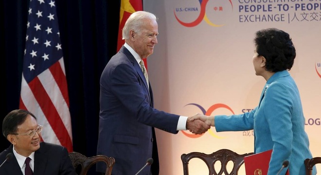 Phó tổng thống Mỹ Joe Biden bắt tay Phó thủ tướng Trung Quốc Lưu Diên Đông tại hội đàm. Ảnh: Reuters