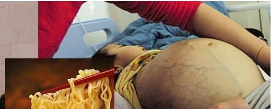 Một cậu bé với phần bụng phình to như một người phụ nữ mang thai khiến mọi người giật mình vì những tác hại ghê gớm của mì tôm.
