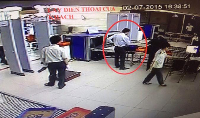 Camera an ninh ghi lại hình ảnh hành khách lấy trộm điện thoại iphone tại khu vực soi chiếu.