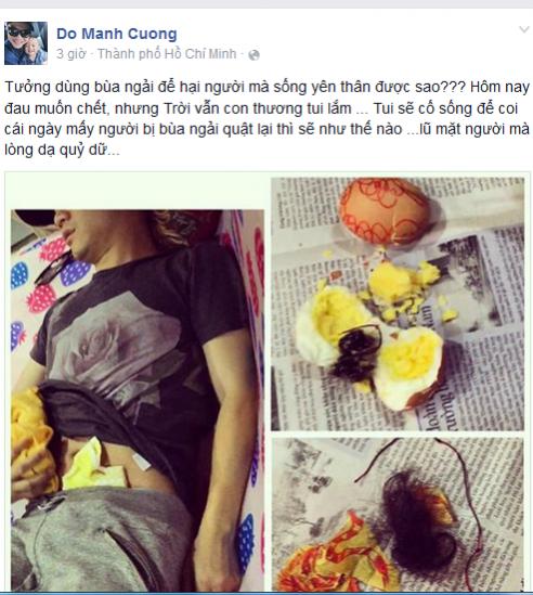Đỗ Mạnh Cường viết: Tưởng dùng bùa ngải để hại người mà sống yên thân được sao??? Hôm nay đau muốn chết, nhưng Trời vẫn con thương tui lắm ... Tui sẽ cố sống để coi cái ngày mấy người bị bùa ngải quật lại thì sẽ như thế nào ...lũ mặt người mà lòng dạ quỷ dữ...