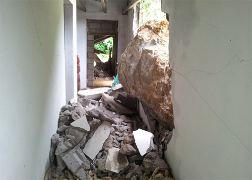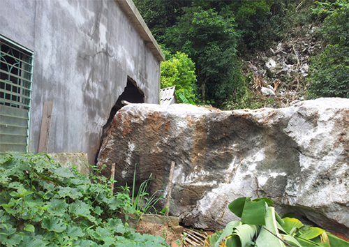 Tảng đá rơi từ trên núi phá vỡ bức tường nhà. Ảnh: Hồng Vân