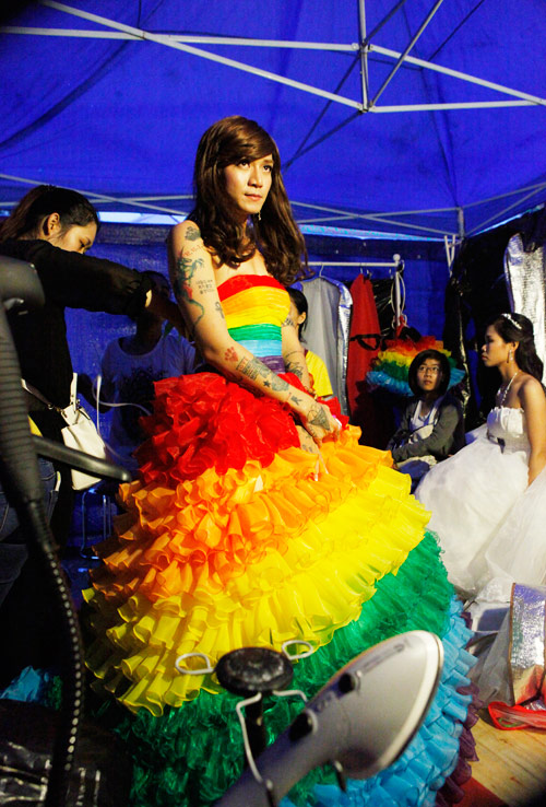 Các chàng trai được "tút tát" giả gái cho phần trình diễn áo cưới trên sân khấu