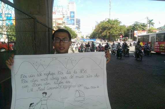 Cách đây ít ngày, hình ảnh nam thanh niên cầm tấm một tờ giấy trắng khổ lớn, cùng dòng chữ viết tay, đứng trên đoạn đường Cầu Giấy (Hà Nội), khiến không chỉ người đi đường chú ý. Tấm bảng ghi: "Tôi vừa tốt nghiệp. Tôi đã là bố. Tôi cần một công việc để mua sữa cho con. Bạn cần tuyển tôi thì liên hệ địa chỉ email...". Bức ảnh sau đó đã lan truyền mạnh mẽ trên mạng xã hội với nhiều ý kiến ủng hộ cũng như chê trách.