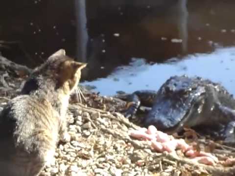 Tuy nhiên, con mèo dũng cảm không hề biểu hiện sự sợ hãi. Nó dần thu hẹp khoảng cách với bộ hàm sắc nhọn của cá sấu, rồi đột ngột nhe nanh giơ vuốt dọa sát thủ vùng đầm lầy. Bị giật mình và bất ngờ, cá sấu hoảng sợ tháo lui về hồ nước gần đó, còn mèo nhà ung dung giành phần thắng.