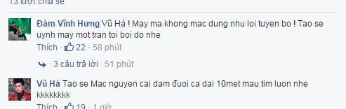 Tuy nhiên, ở ngay bên dưới, “ông hoàng nhạc Việt” bất ngờ để lại một lời bình luận đầy “bạo lực” dành cho ca sĩ Vũ Hà: “Vũ Hà, mày mà không mặc đúng như lời tuyên bố, tao sẽ uýnh cho mày một trận đấy nhé”.