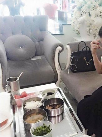 Có những khi bận rộn quá, cô nàng tranh thủ ăn tại cửa hàng. Bữa trưa của cô chỉ có khoanh cá, bát canh và rau.