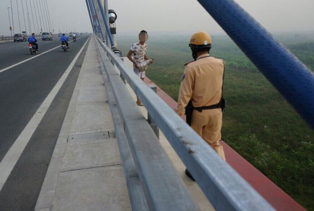 Đang làm nhiệm vụ gần khu vực trên, nhận được tin báo, Thượng sỹ Nguyễn Cao Bằng (Đội CSGT số 2) đã dừng xe máy đi lên cầu để xem xét. Tại đây, Thượng sỹ Bằng chứng kiến nam thanh niên ôm một cục bê tông to, có biểu hiện bất thường, đòi tự tử.