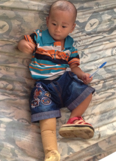 Bé Nguyễn Quốc Huy vừa qua sinh nhật một tuổi được vài ngày, đang trầy trật tập đi bằng chân giả. “Mừng nhất là nó rất khỏe, đến nay hơn 9kg, ăn uống tốt lắm. Mỗi ngày ăn hết 3 chén cháo hoặc bột và uống 6 lần sữa. Nó cũng hiếu động lắm, mới tập nói bập bẹ, kêu ba ba, bà bà suốt”, anh Nam nói. Chị gái của Huy tên Huyền nay được 6 tuổi, đang tự đi học lớp một ở trường gần nhà.