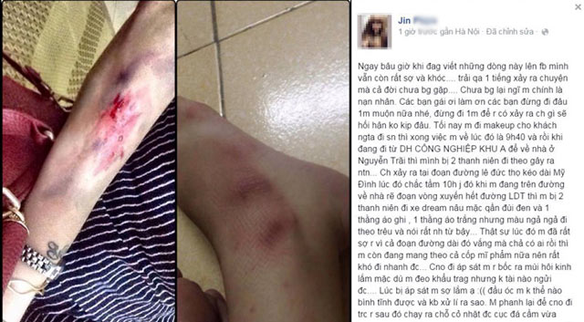 Như đã tin đã đưa, ngày 17.11, trên Facebook cá nhân, cô gái có nickname “Jin P…” đăng tải công khai một bức ảnh bị thương tích ở tay và chân kèm theo thông tin: Trên đường đi làm về qua đường Lê Đức Thọ kéo dài (hiện nay có tên là đường Trần Vỹ, thuộc phường Mai Dịch, Cầu Giấy, Hà Nội) và Lê Đức Thọ (phường Mỹ Đình 2, Nam Từ Liêm, Hà Nội) cô bị 2 thanh niên bám theo, sau đó giật đồ và tấn công.