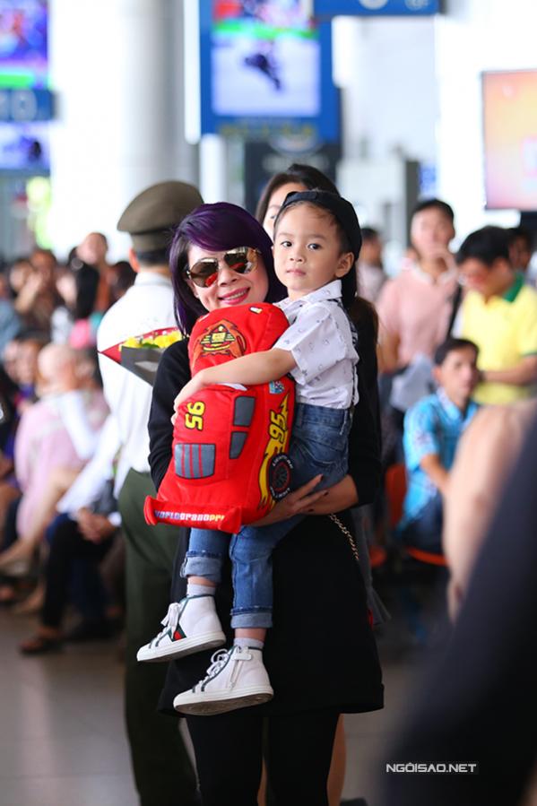 Thanh Thảo ôm hôn con trai vì đã lâu không gặp. Đứng cạnh nữ ca sĩ là Quang Dũng. Anh cũng bay về cùng chuyến với cô.