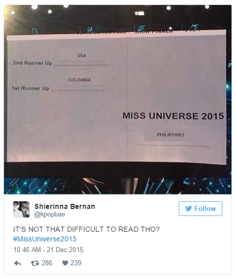 Nó được thể hiện trên vẻ mặt đầy đau khổ của Harvey khi anh thừa nhận mình đã làm phải một điều vô cùng tồi tệ cũng như sự bàng hoàng của Hoa hậu Colombia Ariadna Gutierrez khi chiếc vương miện trên đầu cô được lấy lại và trao cho “Người chiến thắng thực sự”, hoa hậu Philippines - Pia Wurtzbach.