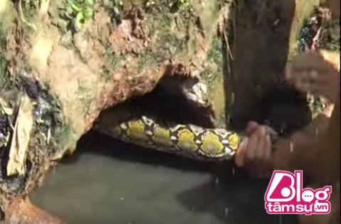 Sự việc xảy ra tại một cái hang nhỏ dưới sông đã khiến nhiều người vô cùng sốc. Ba người đan ông lội xuống sông để cố kéo một thứ gì đó ra khỏi chiếc hang. Và thật kinh hãi khi những người chứng kiến biết được nó là một con rắn khổng lồ.
