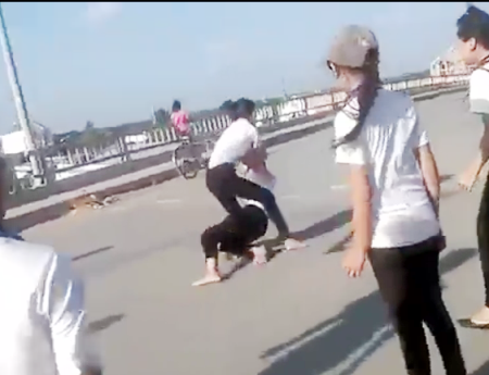 Khi chứng kiến bạn đánh nhau, một học sinh khác cùng trường đã dùng điện thoại quay lại cảnh đánh nhau rồi đưa lên mạng xã hội vào ngày 31/3. Trong clip cho thấy, trong khi hai em T.N.H. và N.T.C.P. đánh nhau, có một số em học sinh bên ngoài đã hô hào, cổ vũ gây náo loạn trên cầu.