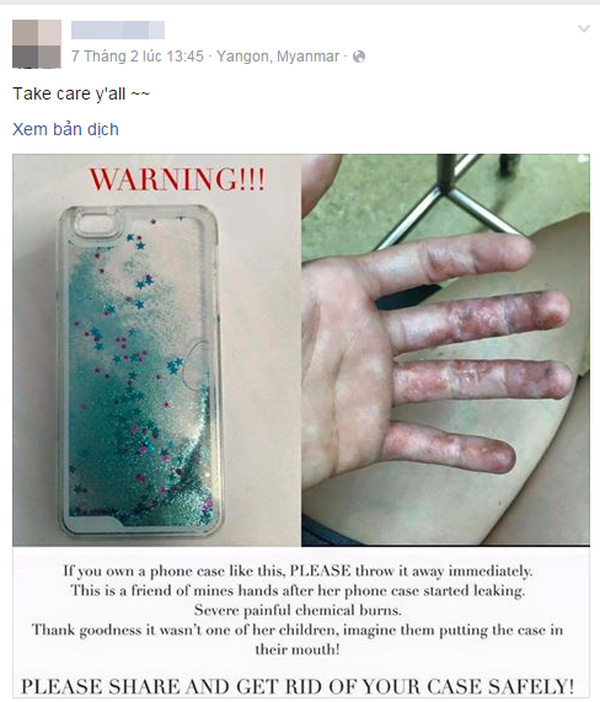 Nội dung hình ảnh được cô gái chia sẻ như sau: "Nếu bạn đang sở hữu chiếc ốp điện thoại giống như thế này, bạn hãy vứt nó đi ngay lập tức. Đây là bàn tay của bạn tôi sau khi sử dụng ốp điện thoại này. Nó đã bị bỏng một cách nghiêm trọng sau khi chất hóa học trong ốp điện thoại bị rò rỉ. Thật may khi những đứa trẻ của cô ấy không bị hề hấn gì. Hãy thử tưởng tượng xem nếu chúng đặt chiếc ốp điện thoại này lên miệng thì hậu quả sẽ như thế nào. Hãy chia sẻ hình ảnh này và giúp những người khác thoát khỏi nguy hiểm".