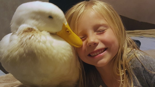Hẳn có rất nhiều đứa trẻ thích ngắm nhìn đàn vịt trong công viên, nhưng với bé Kylie Brown 5 tuổi thì lại ngược lại, cô bé đem con vịt tên Bông Tuyết của mình đi đến công viên chơi.