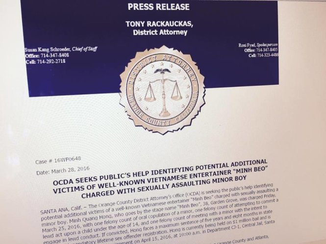 Văn phòng biện lý Quận Cam (OCDA) ngày 28-3 ra thông cáo báo chí về trường hợp của Minh Béo.