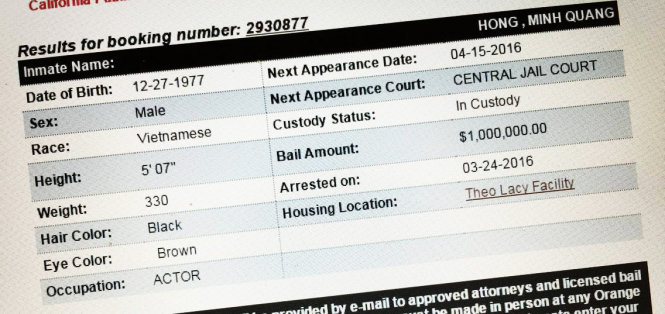 Trong khi đó, ông Dũng Taylor, một bầu sô có tiếng ở Mỹ thông báo Minh Béo bị bắt ngày 24-3, hiện bị giam tại nhà tù quận Cam (Orange County Jail).