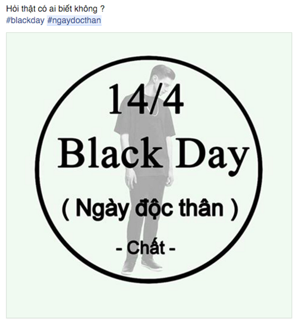 Ngày 14/4 được xem là ngày lễ Valentine Đen (Black Day), ngày dành cho những người độc thân. Ngày này, các bạn trẻ độc thân trên khắp thế giới "ăn mừng" bằng cách mặc những bộ đồ đen ra đường.
