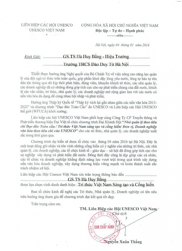 Cùng nhận được thư mời và các giấy tờ thủ tục để tham dự buổi lễ vinh danh “Nhà Quản lý theo tiêu chí Đạo đức Toàn cầu/ Trí thức Việt Nam Sáng tạo và Cống hiến/ Đơn vị, Doanh Nghiệp, Doanh nhân Văn hóa theo tiêu chí UNESCO” (dự kiến tổ chức vào ngày 23/4) như nhiều nhà khoa học khác mà báo Dân trí đã phản ánh, GS.TSKH Hà Huy Bằng, Hiệu trưởng trường THCS Đào Duy Từ Hà Nội, giảng viên trường ĐH Khoa học Tự nhiên – ĐH QGHN cho biết: “Tôi có nhận được nhiều cuộc điện thoại và thư mời của người trong ban tổ chức buổi lễ này nhưng tôi đã thẳng thừng từ chối và không tham gia. Thậm chí tôi còn phát cáu vì họ gọi nhiều lần và nói nộp tiền”.