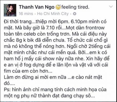 Tối 29/5, trang cá nhân của Ngô Thanh Vân đăng tải những dòng trạng thái khá dài bàn về văn hóa đến muộn của các nghệ sĩ được mời trong sự kiện mà cô cũng tham dự trong đêm. Nữ diễn viên viết rằng thiệp mời 6h tối thì 6h10 cô có mặt, tuy nhiên đến tận 7h10 mà hàng loạt những nghệ sĩ được mời ngồi hàng đầu đều chưa đến.