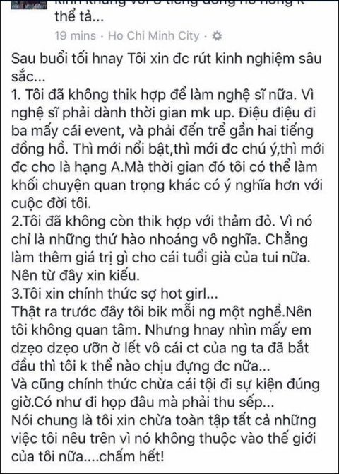 Sau khi đi sự kiện trở về, Ngô Thanh Vân lại đăng tải tiếp tục một dòng trạng thái khác: "Sau buổi tối hôm nay, tôi xin được rút kinh nghiệm sâu sắc. Tôi đã không thích hợp làm nghệ sĩ nữa. Vì nghệ sĩ phải dành thời gian make-up, điệu điệu đi ba cái event và phải đến trễ gần hai tiếng đồng hồ thì mới được nổi bật, thì mới được chú ý, thì mới được cho là hạng A". "Đả nữ" cũng nói rằng mình chính thức sợ hot girl, vì hôm nay nhìn họ "dẹo dẹo ưỡn ờ lết vô chương trình người ta đã bắt đầu" thì cô không chịu nổi hình ảnh đó.