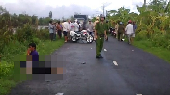 Chiếc xe máy trượt dài trên mặt đường, khiến cụ bà Lâm Thị Hậu té ngã xuống đường bị xe tải cán qua đầu, chết ngay tại chỗ.