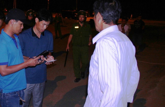 Đại tá Võ Văn Dương, phó giám đốc công an tỉnh Quảng Ngãi (thứ 2 từ trái qua) đang lấy lời khai của một nhân chứng - Ảnh: Trần Mai