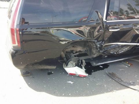 Chiếc xe ô tô Cadillac sau khi xảy ra va chạm với một xe taxi đoạn đối diện nhà ga T1 ở sân bay Nội Bài (Hà Nội) đã bị hư hỏng nặng. Bánh sau của chiếc xe tiền tỷ văng ra ngoài.