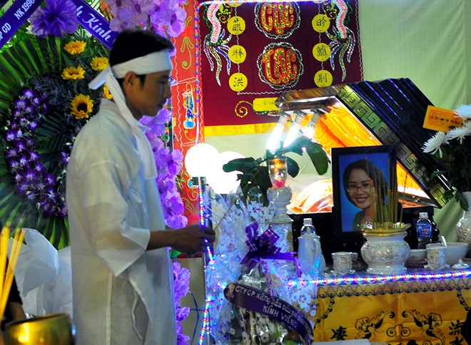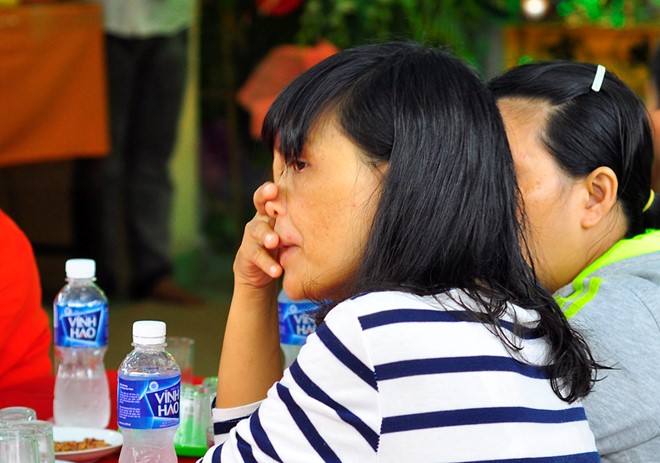 Tại gia đình cô Lê Thị Thanh Liên (37 tuổi, ngụ phường Phú Thủy, TP Phan Thiết), người chồng Trần Ngọc Anh đứng bên linh cữu vợ rồi phút chốc lại mím chặt môi như cố kìm nén nỗi đau. Sau khi lạy tạ những người đến chia buồn, anh ra chiếc bàn kê sát vách tường ngồi thẫn thờ.