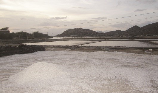 Chúng tôi tìm về vùng ven biển Ninh Hải trong một buổi chiều mưa hiếm thấy ở xứ cát trắng Ninh Thuận. Mặc dù trời đang trong cơn mưa tầm tã, nhưng dọc hai bên đường, các diêm dân vẫn không ngừng tay cào, tay hốt muối cho vào bao tải. Gần đó, một số xe tải đang chờ sẵn để chở muối vào khu làm sạch của một công ty.