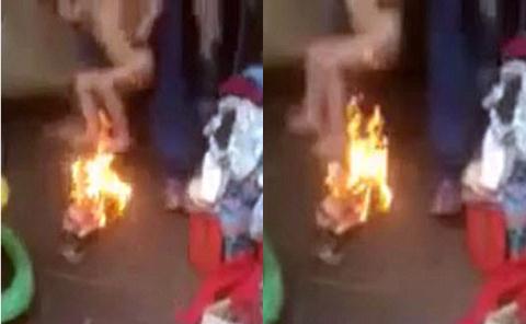 Cảnh cha dượng hơ con 3 tuổi trên đống lửa