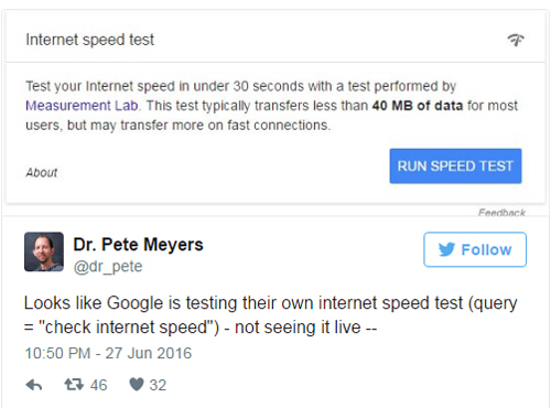 Thành viên Twitter Pete Meyers là một trong những người đầu tiên phát hiện tính năng này. Có vẻ Google vẫn đang thử nghiệm giới hạn trước khi triển khai rộng rãi cho tất cả. Hãng này sử dụng công cụ của Measurement Lab, thành lập năm 2009, để thực hiện việc đo đạc.