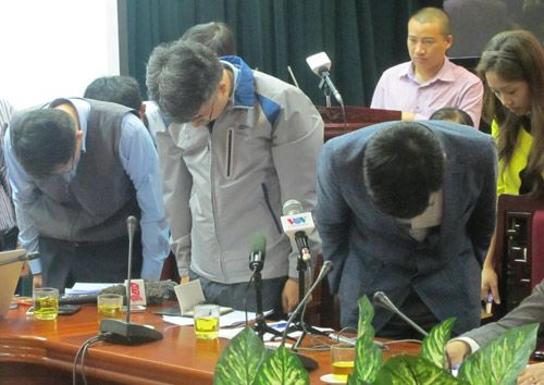 Lãnh đạo Formosa cùng các nhà thầu cúi đầu xin lỗi toàn thể người dân Việt Nam về sự cố sập giàn giáo Vũng Áng cách đây hơn 1 năm. Ảnh: Đức Hùng.