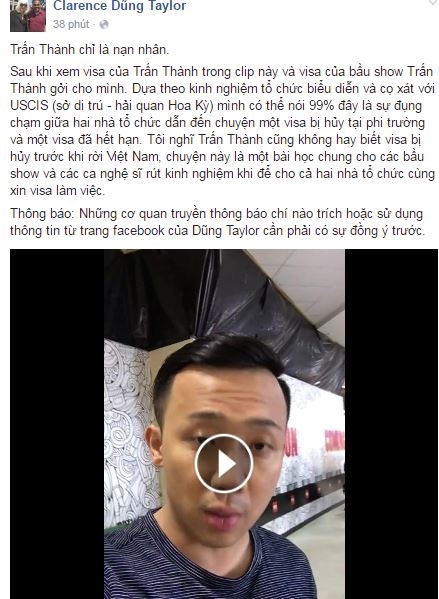 Trên trang cá nhân của "ông bầu" Dũng Taylor - chồng ca sĩ Thu Phươngcũng đăng tải vụ việc Trấn Thành gặp sự cố khi lưu diễn tại đây. Theo đó,ông Dũng Taylor khẳng định Trấn Thành chỉ là nạn nhân của sự đụng chạm giữa hai nhà tổ chức biểu diễn tại Mỹ khi cùng xin visa cho nam MC.