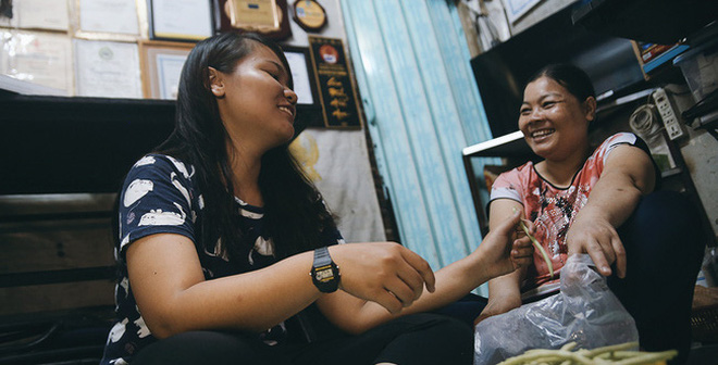 Hai chị em Diệu Liên ngồi đọc tài liệu trên máy tính trong khi cô Lộc đang hí hoáy dưới căn bếp chật chội nhưng tỏa mùi thức ăn thơm phức khắp nhà.