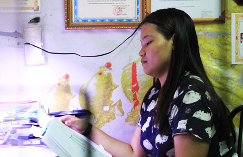 Ánh mắt đượm buồn xen lẫn niềm tự hào, ông Dư kể, từ hồi học mẫu giáo đến tận lớp 12, năm nào con gái đầu lòng cũng đạt danh hiệu học sinh giỏi. Mỗi năm học, cô bé mang nhiều tấm giấy khen và dán khắp nhà. Đến khi bức tường bé xíu của căn nhà không đủ chỗ dán nữa, ông Dư xếp những tấm giấy khen thành xấp đóng lên giá sách.