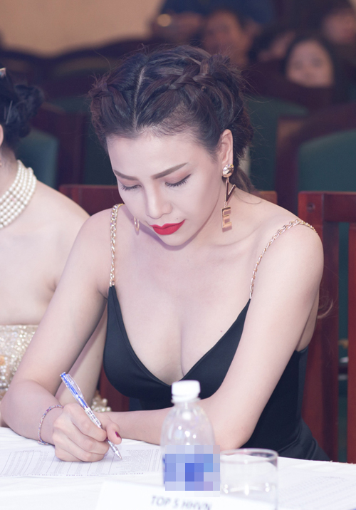 Trên ghế nóng, bộ cánh trễ nải, khoét sâu vòng 1 còn giúp cô hở trọn một phần ngực đầy đặn.